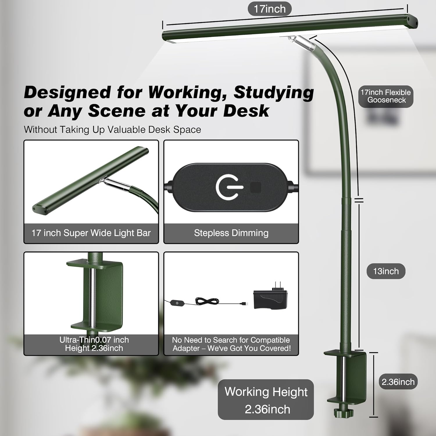 - Big Size & Fit Models: Our table lamp features a 17-inch extra-wide lamp bar that can fully light up your workspace, providing you with enough brightness to complete any task. It is suitable for a maximum work height of about 31 inches, making it compatible with 30-inch monitors (backward compatible with 29-inch, 27-inch, 24-inch, and other monitors). Office desk lamp with easy installation and an adjustable metal clamp design, the sturdy metal clips can support desktops up to 2.36 inches thick.