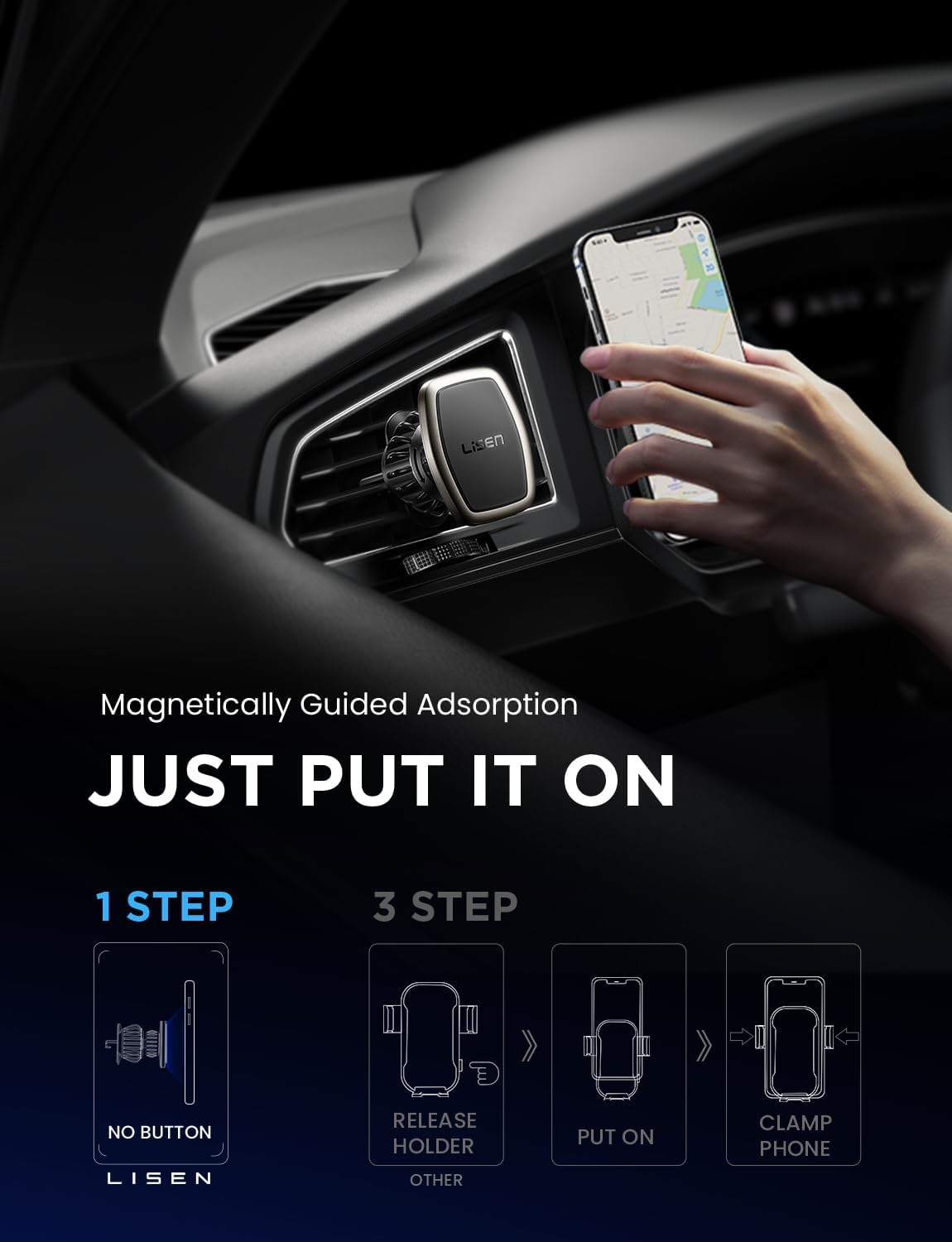 - 👍 CONVINCING QUALITY & UNIVERSAL COMPATIBILITY: LISEN car phone holder won SGS RoHS & SGS CP65 official certification and passed the magnetic force, telephone signal, hook stability and ingredient safety test. Quality is strictly controlled. The car holder holds most smartphones and mini tablets compatible with iPhone 15 14 13 12 11 pro max / XR / X / 8/7/6/5, Note 9 / Galaxy Note20 U, S24 S23 S22 S21 S20 S10 S9 S8 S7 S6, iPad Air 2 / Mini 3 / Pro 9.7 and more.