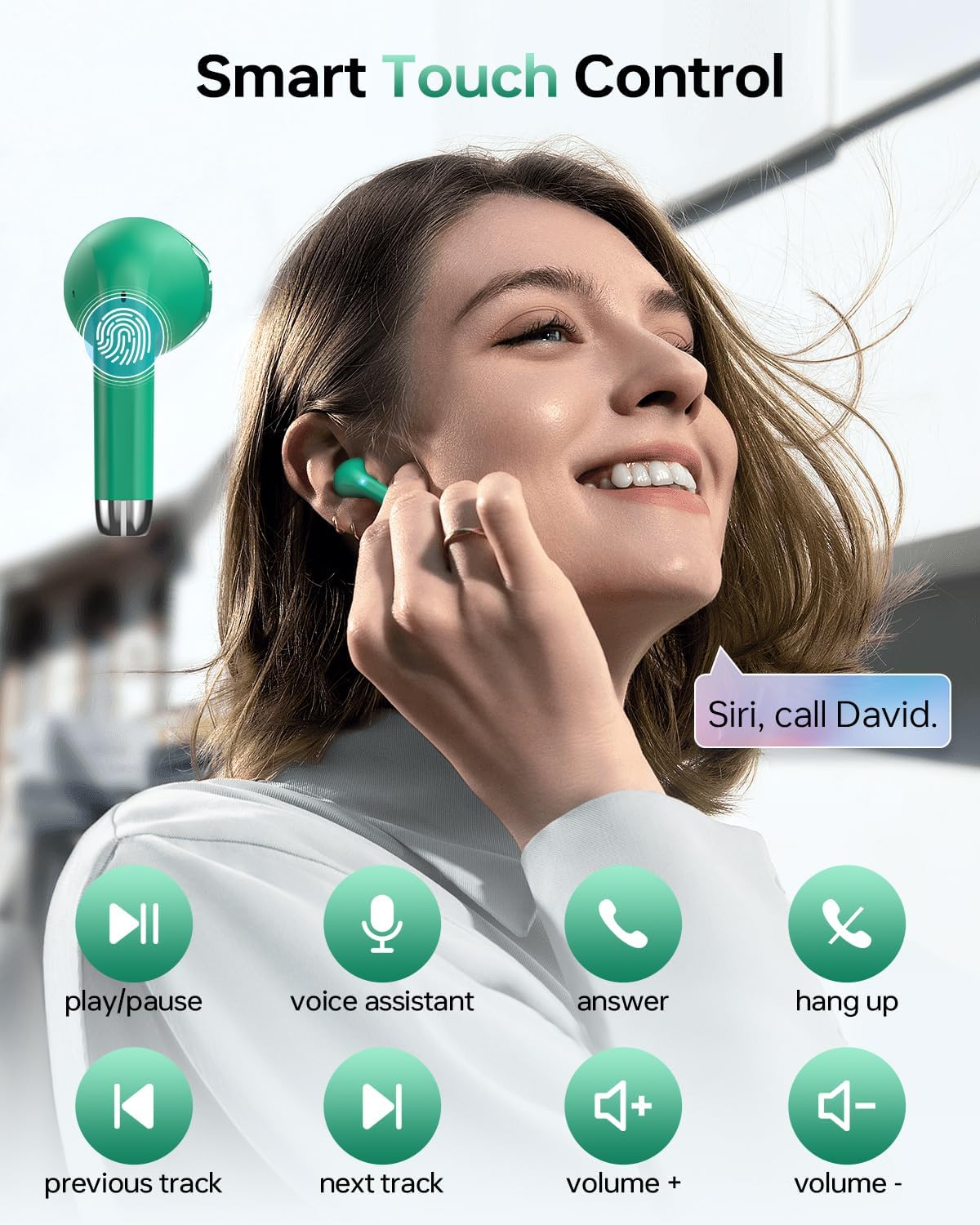 - Smart Touch Control & IPX5 Sweatproof: With smart touch control, you can easily control play/pause, skip to previous/next track, adjust volume, answer/end calls, enable voice assistance and more. What's more, the two earbuds can work alone, you can share one earbud with your partner, perfect for safe driving/working/dating etc. The IPX5 sweatproof can protect the earbuds from damage by sweat and slight raindrops, no worry even in intense sports!