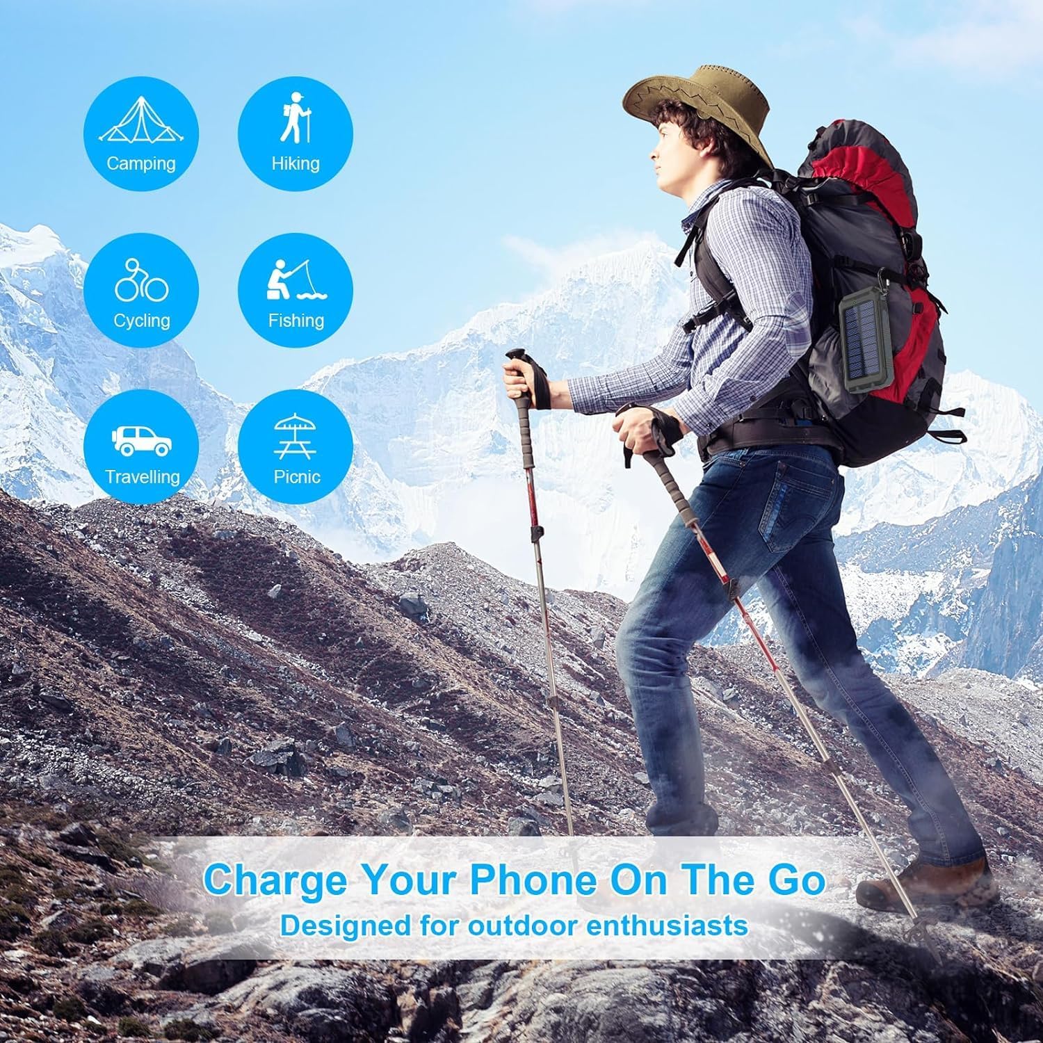 - 【Practical 2 Flashlights 】: The solar phone charger features 2 powerful bright flashlights and a compass, which is essential outdoor equipment. 2 LED flashlights can be used as flashlights with Steady-SOS-Strobe mode for emergencies. The indicators indicate the status of the battery charger timely. The green light is on when charging by a solar, blue light is on when USB charging. The solar travel power bank is an ideal companion for camping, hiking, and other outdoor activities.